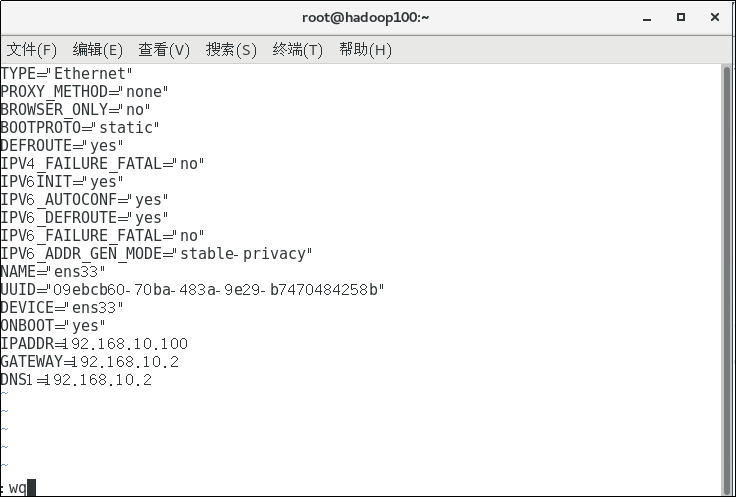 2.进入虚拟网卡设置:vim /etc/sysconfig/network-scripts/ifcfg-ens33